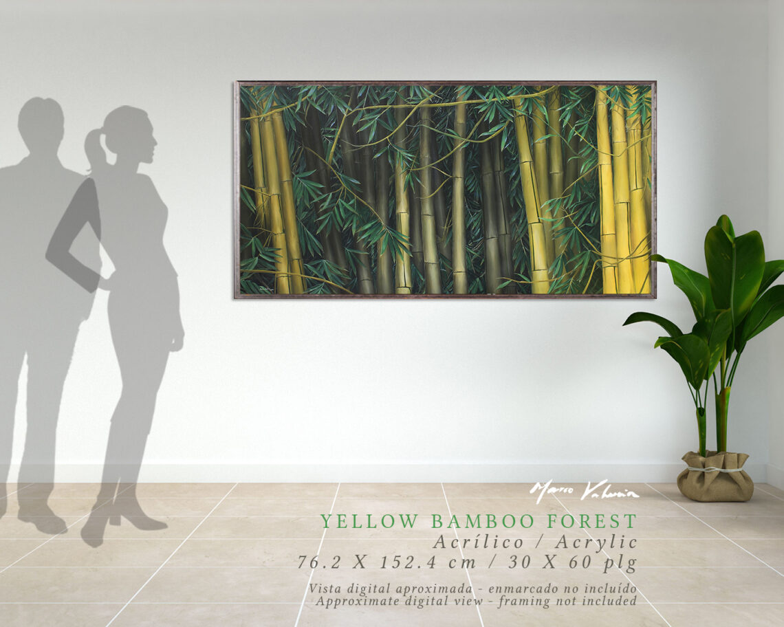 Titulo / Title: YELLOW BAMBOO FOREST Técnica / Technique: Acrílico s/tela – Acrylic / canvas Tamaño / Size: 72.5 X 152.4 cm – 0.72 x 1.54 m – 30 X 60 inches Código obra: Artwork code: MV20252411 Firmada frente y reverso como Marco Valencia 2025 – Signed front and back as Marco Valencia 2025